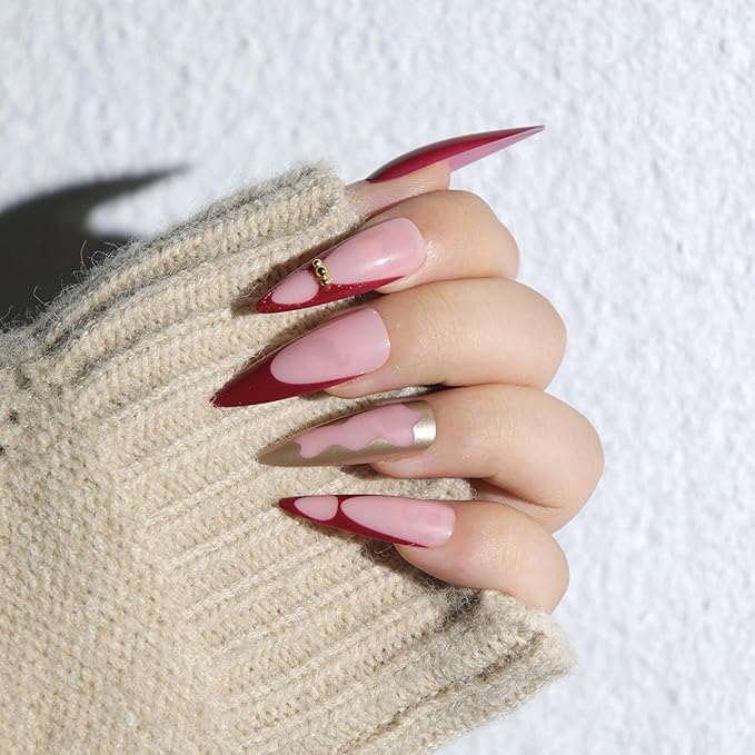 Christmas Press on Nails Long Almond Red Stick on Nail for Women 24pcs